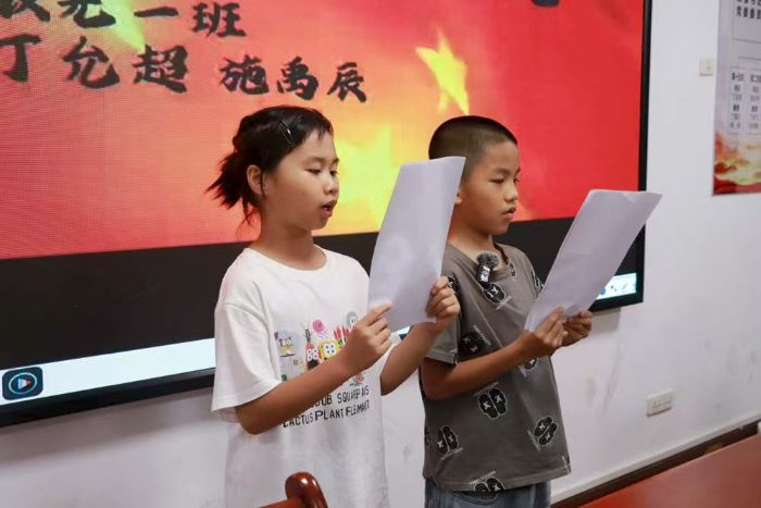 為傳承鄉土文化中的德育智慧,對小朋友們的心理與品德進行雙重滋養,微光小隊在夏令營期間開展了心理健康、紅色黨史等一系列課程,并舉辦了一場紅色匯演活動!稘M江紅》的演繹培養奮斗精神,袁隆平故事的演講播撒農業夢想,齊聲合唱《我和我的祖國》傳遞家國情懷。