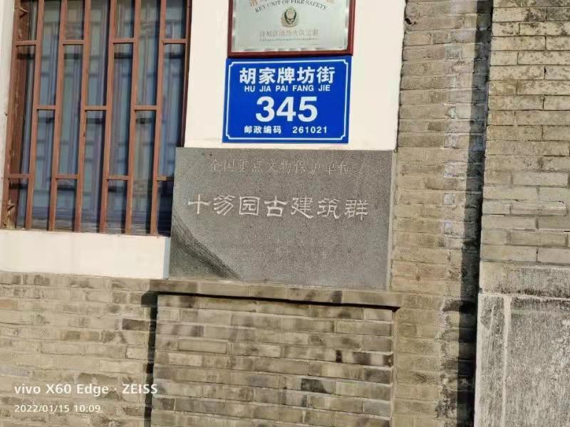 2022年1月19日,實踐小隊走入十笏園,并與工作人員和與行人交流了解了十笏園的歷史和它的建筑風格。十笏園的工作人員告訴我們十笏園為清光緒十一年(1885年),丁善寶購下明代刑部郎中胡邦依的故居,改建為私人花園,稱“丁家花園”,后因其占地非常少,時人常喻之為“十個笏板”而被曹鴻勛題名為“十笏園”。十笏園雖然占地面積小,但其方寸之地可為百年的文化縮影。這一點在實踐小隊進入十笏園之后也深刻體會到了,我們觀察到在其建筑風格上,十笏園既有北方園林的特點又有江南園林的自由風格,在文化遺存上,十笏園保留了鄭板橋、金農等書畫家的真跡碑刻。工作人員還告訴實踐小隊,十笏園的自身特色和它的文化價值使得它被國務院公布為第三批全國重點文物保護單位,并且在國家進一步加強非物質文化遺產保護工作號召下,現在的十笏園不僅保留了原有的遺跡,還融入了許多現代元素,與濰坊旅游業相結合,不斷地綻放著生機。