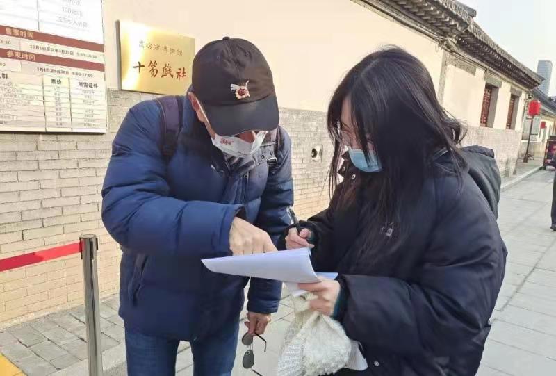 大學生網山東2月20日電(通訊員馬晨旭)文化和旅游部非物質文化遺產司副司長胡雁在文化和旅游部舉行2021年第四季度例行新聞發布會上表示,“非物質文化遺產是中華優秀傳統文化的重要組成部分,是傳承中華文明、賡續中華文脈的重要載體。”非物質文化遺產對于形成城市地標,提高城市知名度亦有重要意義,為此,尋跡—坊韻漫溯實踐小隊的成員于2月19日走進山東濰坊的十笏園,了解濰坊的非物質文化,并以問卷形式對其進行宣傳。