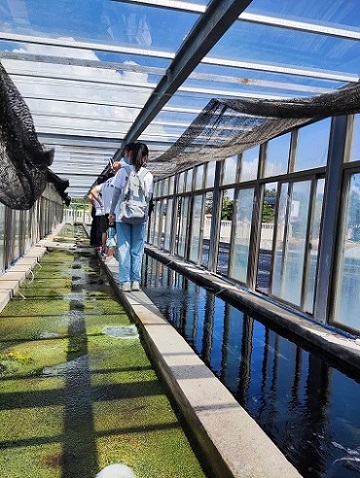 隨后,隊(duì)員們又參觀了海洋牧場(chǎng)的水處理系統(tǒng)。牧場(chǎng)內(nèi)水處理系統(tǒng)設(shè)施完善,設(shè)計(jì)也別出心裁。大功率水泵將廢水抽取到一片長(zhǎng)有大量海藻的水池,經(jīng)由海藻吸收凈化水中的污染物,接著這些廢水將會(huì)進(jìn)入富含大量分解者(微生物)的水池內(nèi),以最原生態(tài)的方式將水處理干凈,減少了化學(xué)藥物的使用,最大程度地防止了水污染。生態(tài)效益與經(jīng)濟(jì)效益同時(shí)得到保障,使得牧場(chǎng)內(nèi)呈現(xiàn)一派綠色和諧的氛圍。
