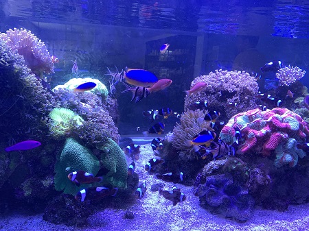 調(diào)研團(tuán)隊(duì)員經(jīng)由山根鎮(zhèn)鎮(zhèn)長(zhǎng)盧裕東等當(dāng)?shù)仡I(lǐng)導(dǎo)帶領(lǐng)參觀海洋牧場(chǎng)。隊(duì)員們首先參觀了一處規(guī)模龐大的生態(tài)缸展區(qū),缸里布滿各種爭(zhēng)奇斗艷的珊瑚,隨波搖曳的海藻。海藻的主要種類為海葡萄,它們的球狀小枝形如葡萄,大小如魚籽,密密麻麻地綴在纖長(zhǎng)的直立枝上。除此之外,缸里還有各種各樣的靈動(dòng)優(yōu)美的海洋動(dòng)物:二十多種形態(tài)各異的小丑魚、自由暢行的藍(lán)色雀鯛、慵懶慢游的刺尾魚等,讓人大飽眼福,百看不厭。