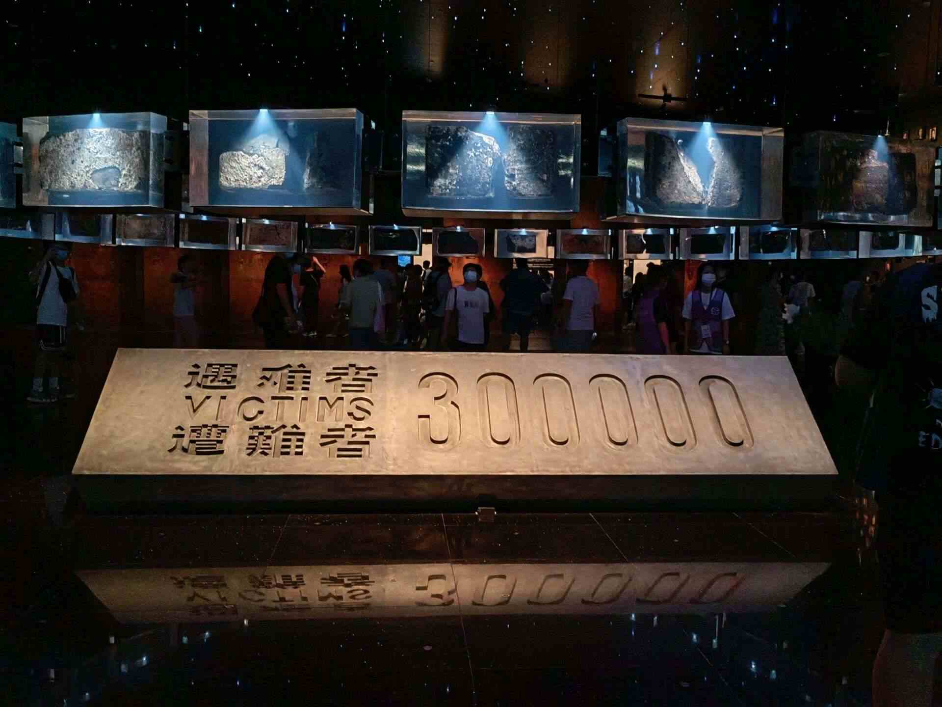 胞紀念館,在紀念館門口有四組雕塑,分別為《家破人亡》《逃難》《冤魂吶喊》《勝利之聲》。每種雕塑的形象都展現的淋漓盡致,這些巨大的雕塑給人以強烈的視覺沖擊,把人瞬間帶回到過去。沿路的石壁,地面等建筑均采用黑色鏡面花崗巖敷貼,災難之墻刻寫十三國文字作為背景墻。舊館庭院白色的鵝卵石寓意累累白骨,而新館的砂石,踩在上面發出的聲響猶如冤魂的低聲控訴。這一路肅穆的環境,讓人心情沉重壓抑,也使他們感受到當年屠殺現場的血腥與絕望。令人震撼的還有那哭墻,那是用100個國家的文字寫下“300000遇難同胞紀念館”。