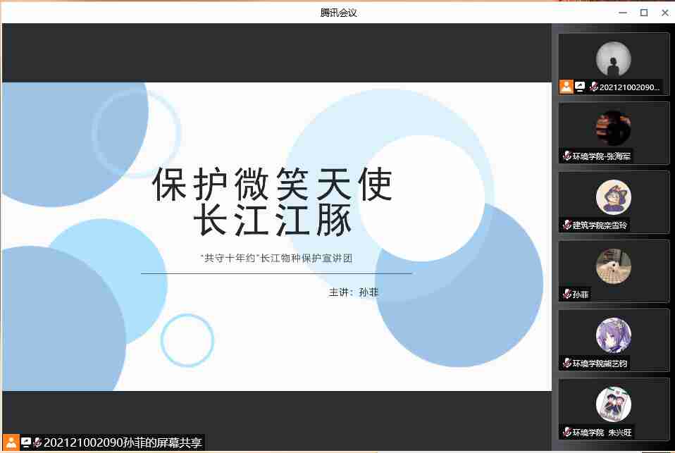 為積極宣傳長江生態大保護的重要意義,引導大學生們了解并關愛和保護“水中熊貓”——長江江豚,8月10日晚,團隊宣傳組開展《保護微笑天使-長江江豚》科普云課堂。學院團委負責人陳亞會、團隊指導教師楊靜、學院各年級學生以及兄弟院校多名學生等參加。
