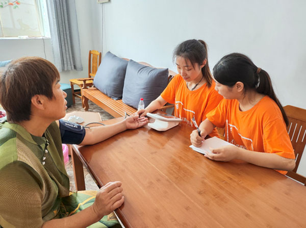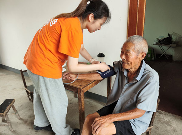圖為團(tuán)隊(duì)成員吳姿穎為老人測量血壓攝影:龐婉婧