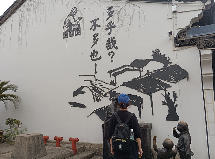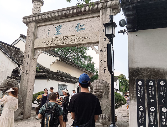 下車伊始,還未看見先生的屋舍,映入眼簾的首先是用石頭砌成的巨大城墻,上面刻畫的一副水城的模樣,標著四個大字—魯迅故里,而這幅畫旁邊呈現的便是先生的畫像,寥寥幾筆描繪出先生硬朗的輪廓,透露著不屈不撓的民族氣節和不畏犧牲的民族精神。在這里小分隊成員不禁有感而發,拉起了橫幅與敬愛的魯迅先生合影留戀。魯迅故里便鑲嵌在這水城之間與,其他的房屋并沒有什么兩樣,進入街道令隊員印象深刻的是一副牌匾,上面題寫著兩個大字“仁里”,也就是仁人賢士的居所。而許多房屋樓閣的白墻上也被刻畫上了魯迅先生的影子,譬如他筆下孔乙己所說過的“多乎哉?不多也!