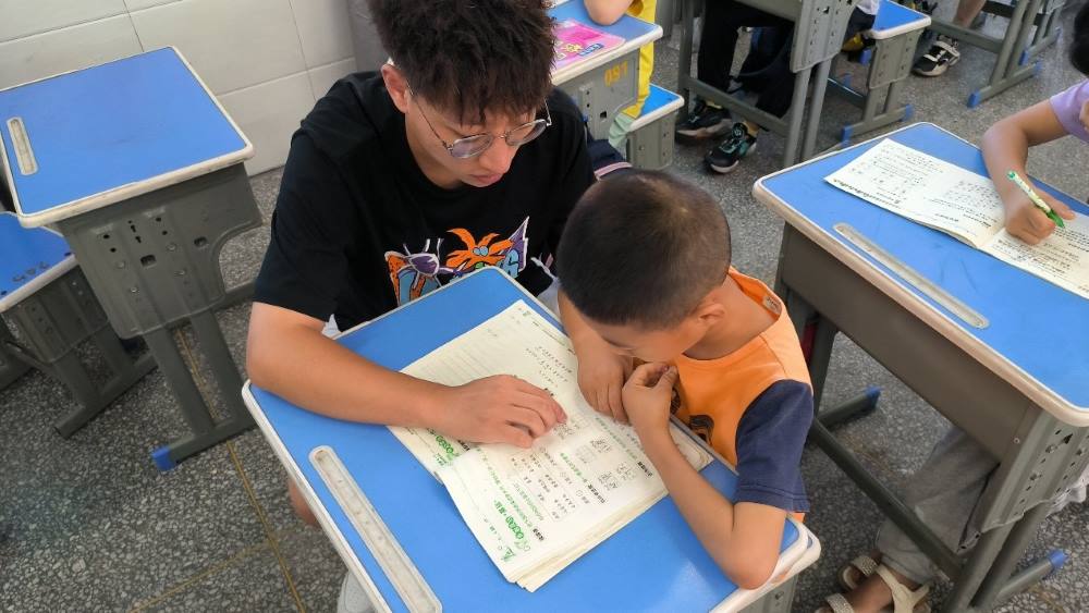 圖為蒲公英支教社會實踐團隊成員一對一輔導(dǎo)孩子作業(yè)。