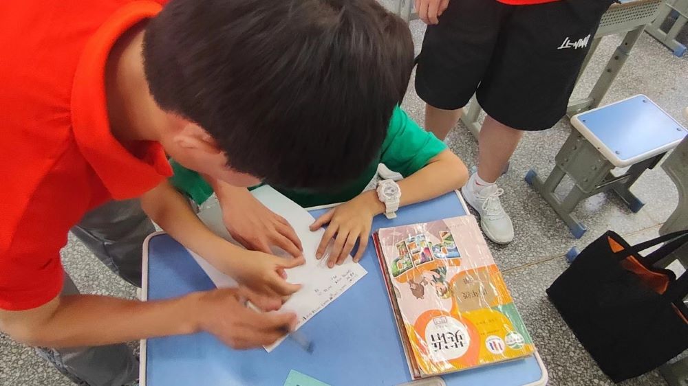 圖為蒲公英支教社會實踐團隊成員輔導孩子們作業。