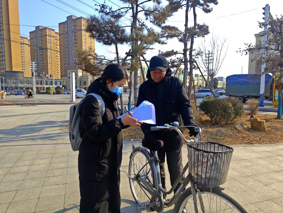 圖為實(shí)踐隊(duì)員采訪居民袁女士(中國(guó)青年網(wǎng)通訊員 張?zhí)鹛?攝)