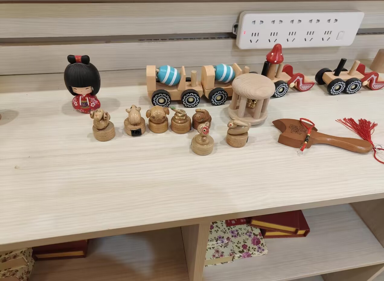 圖為木旋玩具作品。中國青年網通訊員 劉鈺瑄 供圖實踐隊員還注意到在博物館中設有專門供幼兒園的小朋友體驗非遺文化的場所,這是將非遺文化融入日常生活,傳承非遺文化的良好途徑,在這其中,沒有像手機、電腦這樣的電子設備,取而代之的是用木材篆刻而成的玩具,在博物館之內,完全可以滿足小朋友們玩樂的心理,沒想到的是,一塊塊普普通通的木頭,經過匠人的打磨鍛造,竟然能夠變成小朋友們心心念念的玩具、雙層床、冰箱、木板拼圖,全部使用木材打磨加工而成。館內提供了供小朋友們制作木選玩具的場所,從木桌上的染色顏料和各式各樣的木旋玩具中不難看出真正的“寓教于樂,寓樂于學。”