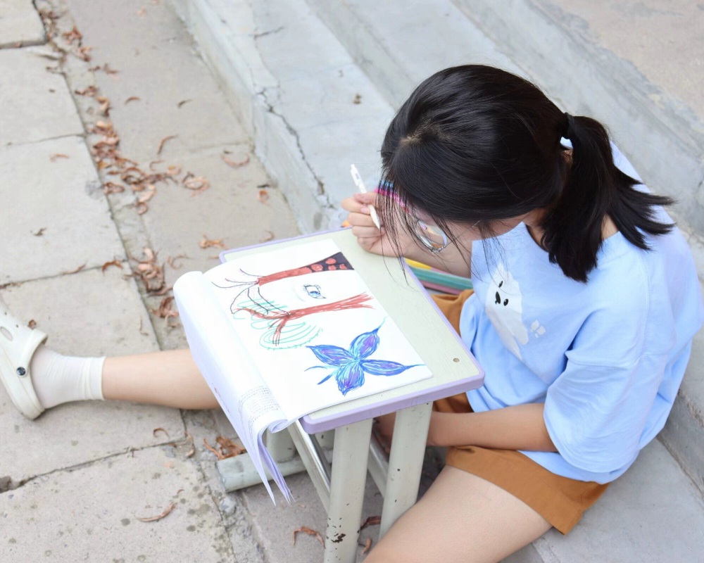 繪畫課與手工課“齊頭并進”。教室里空空蕩蕩,學生們紛紛來到操場,在籃球的拍打聲、樹葉的搖動聲中,沉浸于周遭環境,任由思緒徜徉,帶動筆尖在紙面上記錄對美的感知。不久,一棵樹,兩個小人,幾片葉子,生動的圖像緩緩鋪展開來,無聲敘述著本節課堂的主題——“我的校園趣事”。手工課上,學生們睜大眼睛,視線緊跟著志愿者的拆解動作,手指也伴隨著志愿者的講解,靈活地翻折拉拽、按壓、輕拂,將童心與期許折進最終成型的栩栩如生的“龍”中,寄語龍年剩余時光中值得展望的每一天。