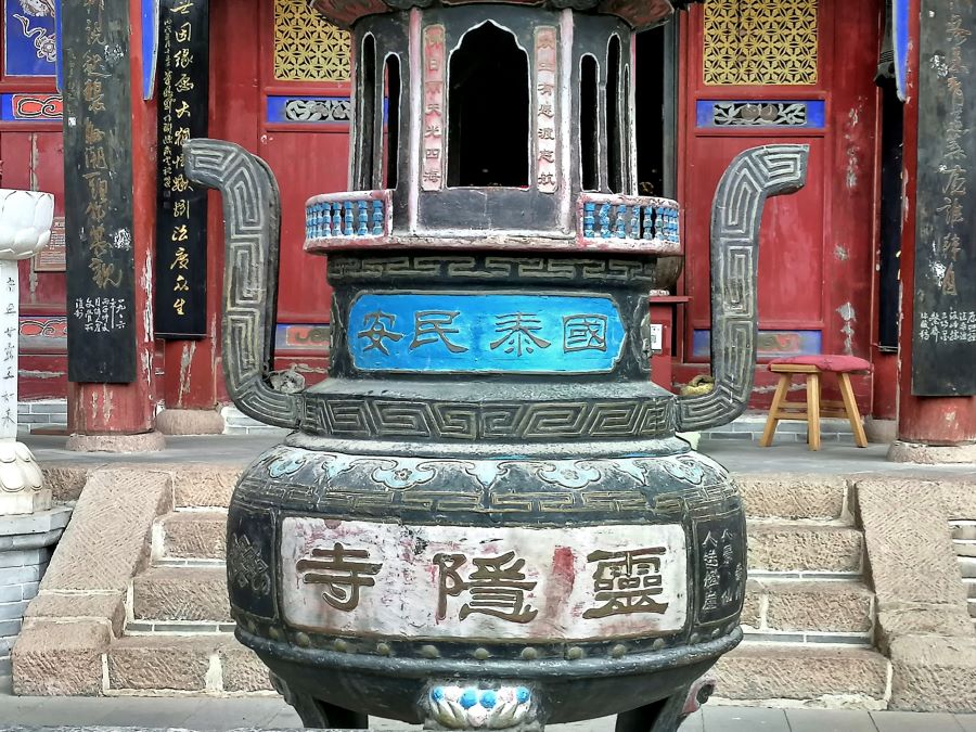 靈應寺作為整個西崖的核心,在殿前矗立著一座三米高的寶塔,極其莊嚴、肅穆。實踐團成員觀察到寶塔的塔身上刻著“國泰民安”四個大字。“靈應”意為愿望成真,僧人將“國泰民安”的寶塔放于“靈應”之下,表達了寺院對于中華民族的美好祝愿。