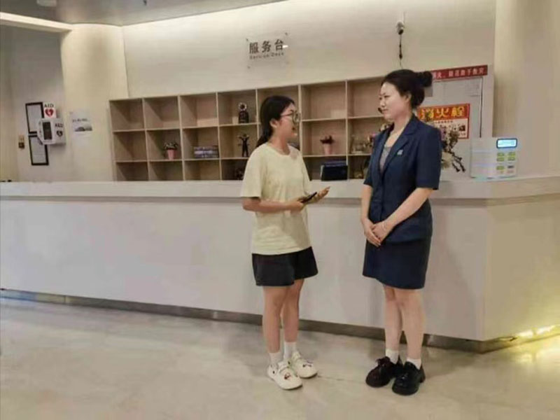 圖為實踐隊員與浴場工作人員交流。中國青年網通訊員 蓋藝蔚供圖