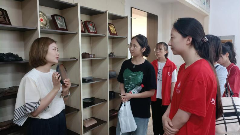 圖為傳承人向調研隊成員講解河洛澄泥硯知識