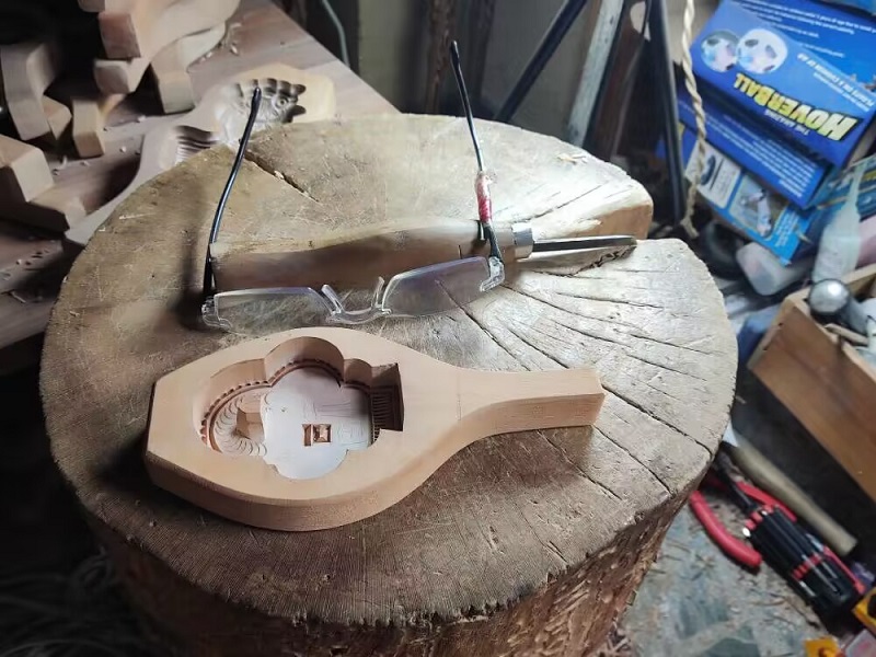 一副眼鏡,一把刻刀,一盞臺燈,組成了王丕文老師的工作臺。長時間的低頭雕刻,壓彎了王師傅的脊背,讓王師傅的雙手布滿老繭。日復一日,年復一年,潛心雕刻,代代相傳。