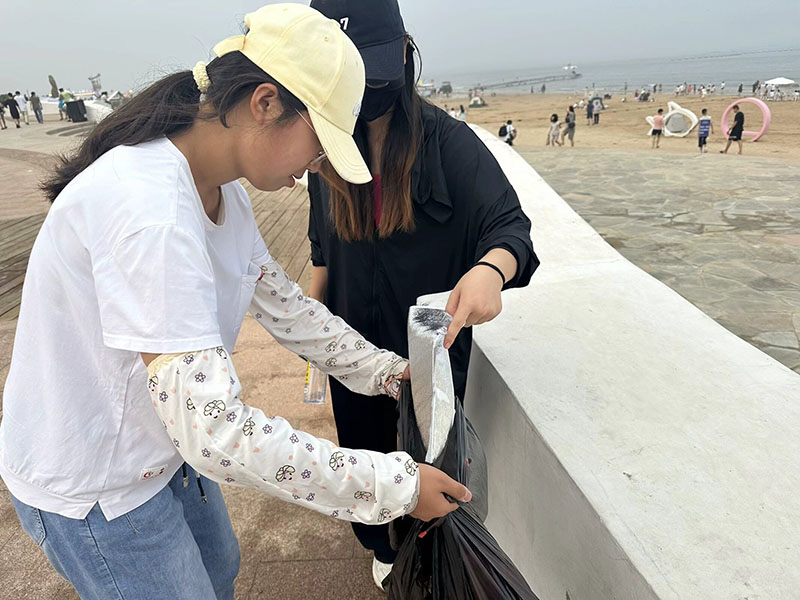 我們自發地分成兩組,一組負責進行凈灘活動,另一組負責向游客們進行海洋環保宣傳。我是第一組的成員,主要負責沙灘上來的垃圾拾取工作。凈灘活動,作為一種致力于清理水體周邊垃圾并喚起公眾環保意識的公益活動,不僅是對自然環境的一種直接保護行動,更是對我的一次深刻洗禮。參與凈灘活動,我最直接的感受就是海洋、河流等水體周邊垃圾問題的嚴重性。親眼目睹那些被遺棄的塑料袋、泡沫盒、塑料瓶等垃圾,讓我深刻意識到,人類活動對自然環境造成的破壞是如此觸目驚心。與此同時,另外一組提前準備了海洋保護宣傳冊,通過他們的宣傳來提高游客們保護海洋環境的意識。值得高興的是,聽完我們實踐隊員的科普后,許多游客自發地加入我們的凈灘活動,為海洋保護貢獻自己的力量。沙灘上一抹抹彎著腰的人,是致力于保護環境的有為人民的縮影。準備離開時,看著煥然一新干凈的沙灘,我感受到了前所未有的寧靜與滿足。夕陽的余暉溫柔地灑在細膩的沙粒上,每一粒沙似乎都鑲嵌著金色的光芒,閃耀著歲月靜好的溫柔。海風輕輕拂過臉龐,我們社會實踐隊隊員們所有的努力與汗水,在這一刻化作了心中的甘甜。