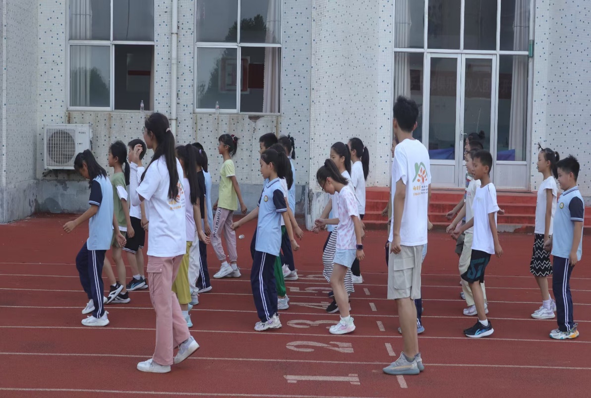 圖為實踐團成員帶領(lǐng)孩子們練習(xí)。山東理工大學(xué)趙一提供在與孩子們的相處中,我逐漸學(xué)會了以更加寬容和耐心的態(tài)度去面對每一個獨特的靈魂。我鼓勵他們勇敢嘗試、敢于創(chuàng)新,讓他們在運動中釋放天性、展現(xiàn)自我。那些網(wǎng)絡(luò)名曲的跳躍、童謠古詩的吟唱、還有令人捧腹的小品表演都讓我驚嘆于孩子們的才華與創(chuàng)造力。我們之間的距離也在不知不覺間拉近。