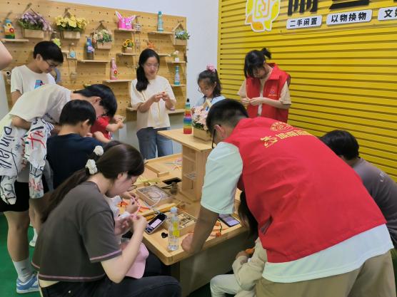 臨近活動尾聲,實踐小組與社區負責人開展了“扭扭棒”手工活動,活動開展前,社區為該活動準備了所需的材料,小組成員上網學習相關手工視頻以更好地帶領小朋友完成作品,活動過程中小朋友們都非常的開心并在小組成員的指導下大膽展開想象力,扭出屬于自己的精美作品,極大地鍛煉了他們的動手能力以及思維的敏捷性。在此之后小組成員還與小朋友進行了課外閱讀,大家坐在一起討論故事,吃西瓜,十分和諧融洽。