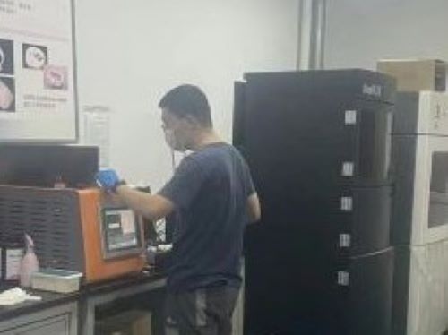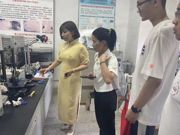 在中科院海西研究院工作人員的帶領下,實踐隊進入增材制造實驗室中,參觀了解SLA,DLP,LCD與FDM及其他技術類型打印機。實踐團隊指導老師張晨在增材制造方面有著扎實的理論知識與實踐基礎,她帶領實踐隊進行增材制造實驗室內參觀并對每一臺打印機的功能、原理以及不同打印機之間的差別進行詳細的講解。于此,實踐隊成員們對每一臺3D打印機所對應的技術與功能作用適用范圍有了更深層次的了解。