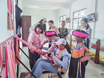 瀾滄有著豐富的民族非遺文化資源,實踐團在富邦鄉團委副書記曹芝才的帶領下首先前往賽罕村拜訪竹條編織技藝非遺傳承人李扎而,純手工竹編不僅實用而且做工非常細致。接著實踐團前往佧朗村考察,領略了拉祜族傳統布編技藝,親手實踐了白坯布的紡織和肩帶的編制,仔細研究了拉祜族編織方式與顏色選擇傾向,收集了大量文化資料用于進一步研究。隊員發現拉祜族的編織以手工攢動為主,花色均為當地婦女一絲一線手工制作。實踐團也發現繁復的編織技法、缺乏銷售渠道導致該地編織產品雖美麗優質,卻外銷困難。實踐團進一步了解到拉祜族非遺文化的深厚底蘊,本土居民對其的喜愛與重視以及他們如今對于非遺文化的傳承所面對的困境。拉祜地區相當重視對本土文化的傳承工作,在走訪勐朗鎮中心小學,通過校長介紹實踐團了解到瀾滄縣每個鄉鎮通過開設希望小課堂有意識的去培養兒童對于少數民族文化的技能學習與傳統非遺傳承。