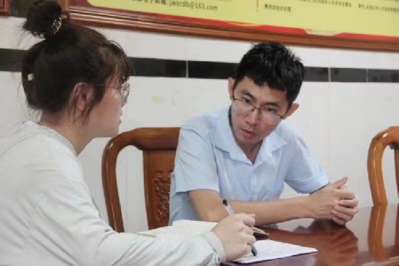圖為“啟仰”成員與放坡村駐村第一書記進行交流會談。中國青年網通訊員 王鑫怡攝