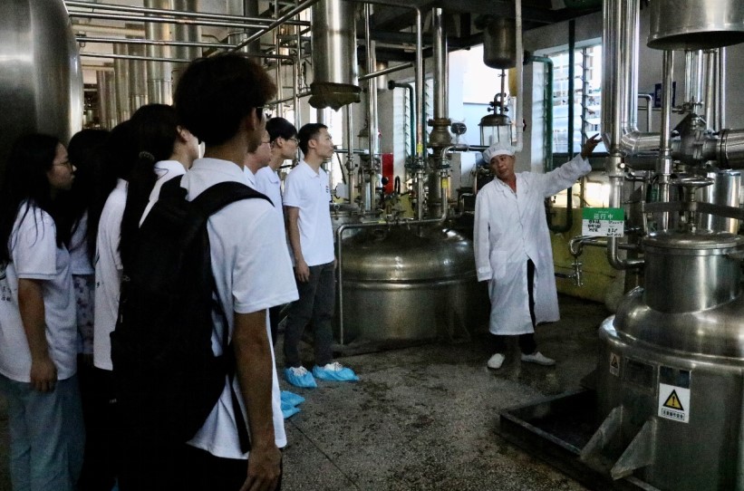 緊接著,實踐隊參觀了一片天醫(yī)藥集團有限公司,周經(jīng)理作為公司生產(chǎn)車間負責人,親自帶領實踐隊成員參觀了藥物研究所和萃取車間,并詳細介紹了砂仁的深加工過程。首先,他向成員們展示了將砂仁葉子放入機器中進行攪碎的步驟。接著,攪碎后的葉子會被運送到蒸餾器械進行高溫蒸餾,并進行反復的萃取過程。最終,通過這一系列的操作,可以得到砂仁的萃取精油。令人欣喜的是,該公司近年來在技術上取得了重要突破,砂仁的萃取率從每公斤千分之一提升到千分之二,這意味著他們能夠更高效地生產(chǎn)出更多的萃取精油。據(jù)介紹,公司2022年收購并使用砂仁葉數(shù)量高達24.2噸,同年復方春砂顆粒產(chǎn)品銷售額達到了1.7億元,占主營業(yè)務銷售額的4%左右。為了進一步推動產(chǎn)品的研發(fā),公司還與廣州中醫(yī)藥大學等高校建立了產(chǎn)學研基地,這將為公司未來春砂仁系列產(chǎn)品的研發(fā)提供更多的支持,同時也為陽春市春砂仁的高質(zhì)量發(fā)展做出貢獻。