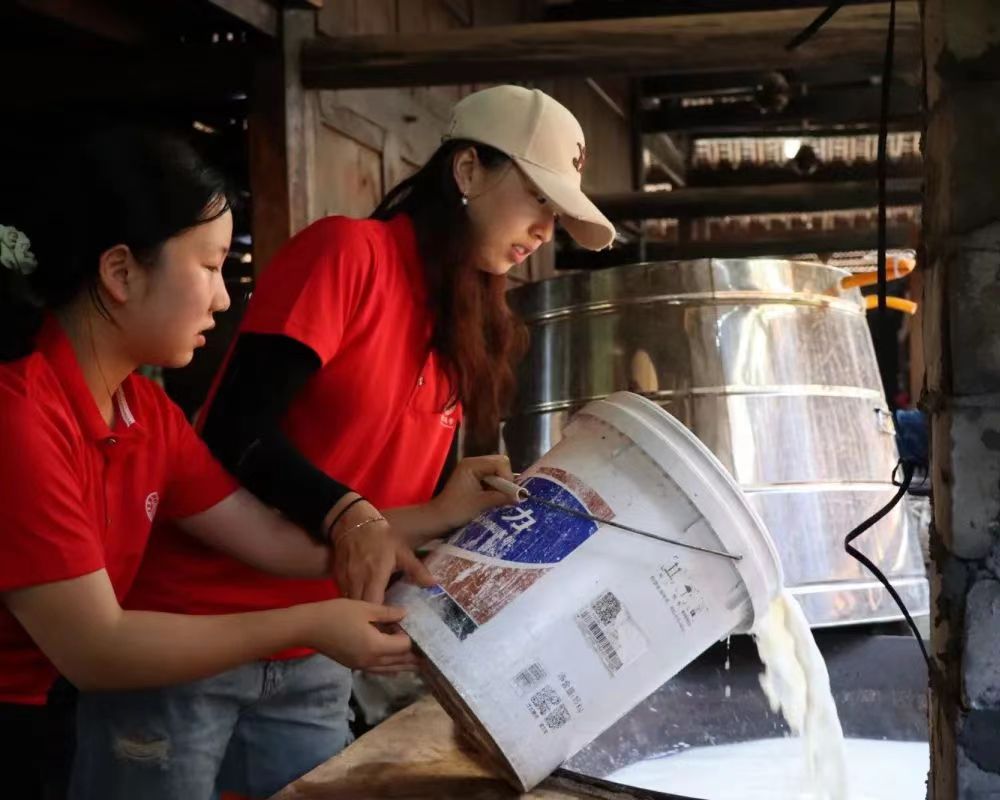 隊(duì)員們的第二站是堯古村深處一所古色古香的小屋—釀酒作坊。由作坊何阿姨介紹,深入了解到酒不僅是堯古布依族家庭的日常必備,更是他們?cè)诠?jié)日盛宴、待客時(shí)必不可少的佳品,承載厚重的布依文化。