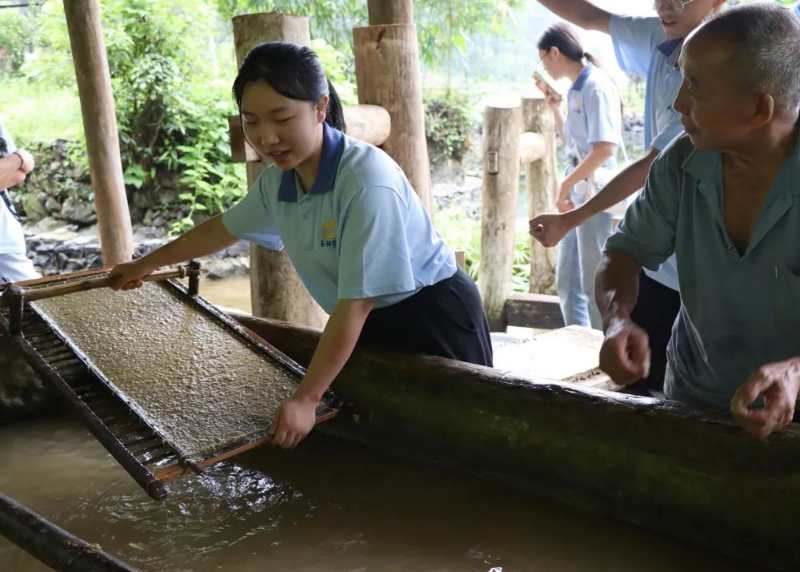 隊(duì)員們?cè)谡J(rèn)真聆聽(tīng)造紙工序的同時(shí),也在老人的指導(dǎo)下進(jìn)行“撈紙”的體驗(yàn)。得到的紙漿經(jīng)過(guò)倒鋪、壘壓、拍干等步驟后,晾掛在竹竿上,經(jīng)過(guò)一定時(shí)間后便得到造紙成品。通過(guò)爺爺?shù)慕榻B,隊(duì)員們對(duì)古法造紙的工藝流程有了更多的認(rèn)識(shí),也對(duì)古法造紙工藝的保護(hù)和傳承有了全新的思考。
