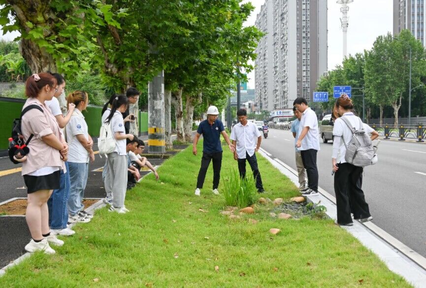 7月20日,在中國(guó)一冶領(lǐng)導(dǎo)的帶領(lǐng)下,實(shí)踐隊(duì)來(lái)到宜昌市黃河路和西壩路參觀已落成的海綿道路,與普通道路不同的人行道透水鋪裝、生態(tài)卵石溢流口、下沉式綠地等措施,不僅起到了道路綠化美觀的作用,還大大降低了徑流的形成和污染,對(duì)預(yù)防城市內(nèi)澇至關(guān)重要。
