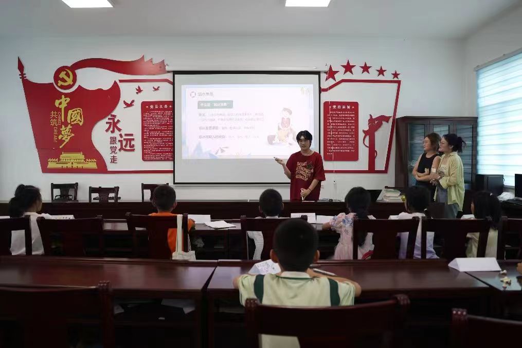 在九崗里村的社區教室里歡聲笑語不斷,學生團隊和孩子們稚嫩的臉龐構成了九崗里村一道獨特的風景。7月4日,學生團隊為孩子們上了一堂別開生面的教學課。此次課堂活動主要為學生講解遠離野外危險水域、不慎落水應該如何自救、當遇到同伴落水時不要進行錯誤施救、溺水急救的定義、原因和措施以及游泳注意事項五個部分安全知識。通過此次防溺水安全教育課堂活動,學生們不僅學習了寶貴的防溺水知識,還增強了自我保護意識和能力。
