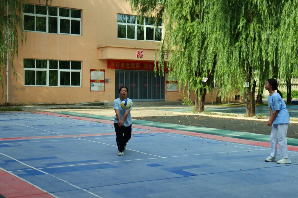 炙熱的風拂過,籃球擦過空中,與籃筐撞擊出“砰砰”的聲響。籃球場上,學生們與志愿者打成一片,激烈地傳球運球,找準時機一躍而起完成著一次又一次精準的投籃,詮釋著對體育的熱愛。不遠處,排球在空中飛來飛去,孩子們謹記志愿者的動作指導,微微俯身,繃直的手臂迎上,球先臂膀一步而起,承載著學生們的熱情沖入“云端”。精彩的球類運動讓人目不轉睛,氣定神閑優雅的八段錦也令人駐留,學生們模仿著志愿者的動作,不斷地調整姿勢,轉頭、推手,認真地比劃著。