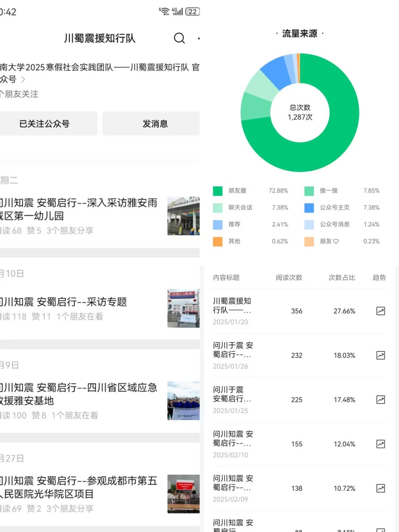 在實踐成果方面,首先是公眾號宣傳。團隊成功運營防震減災公眾號,通過精心策劃的內容布局與定期更新,不僅有效強調地震的災害性,還廣泛普及了地震科學、應急自救等關鍵知識。得益于高質量的內容輸出與精準的目標受眾定位,公眾號的閱讀量迅速突破千次大關,成為公眾獲取防震減災信息的重要渠道,有效提升了社會整體的防災減災意識。