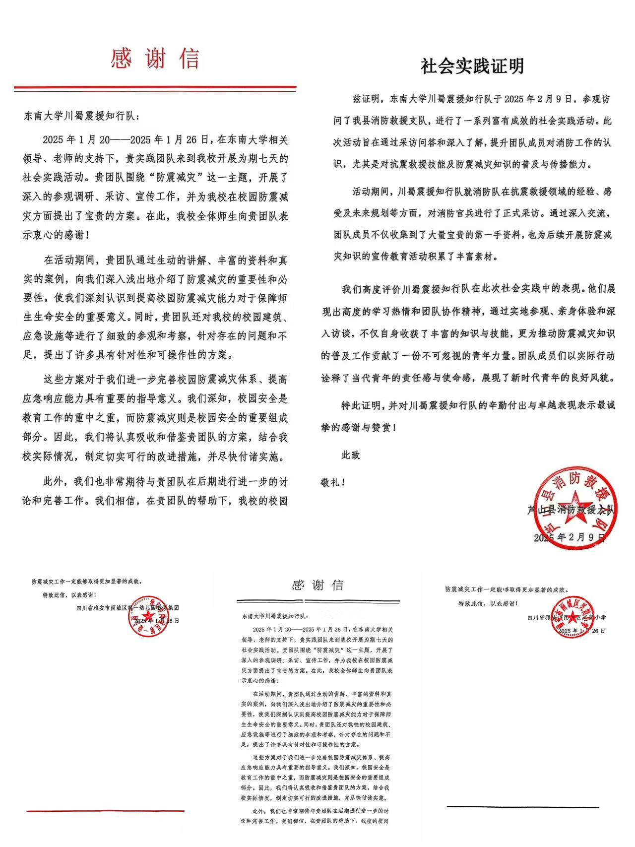 基于對防震減災教育的深刻理解,團隊為學校提出了多項切實可行的教育建議,旨在構建更加完善的校園防震減災體系。這些建議不僅贏得了學校的認可,還收到了多封感謝信,部分建議更是被直接采納并付諸實施。此外,在深入消防隊進行實地調研后,團隊的提案同樣獲得了消防部門的高度評價和肯定,為深化合作、共同提升社會防災能力奠定了堅實基礎。
