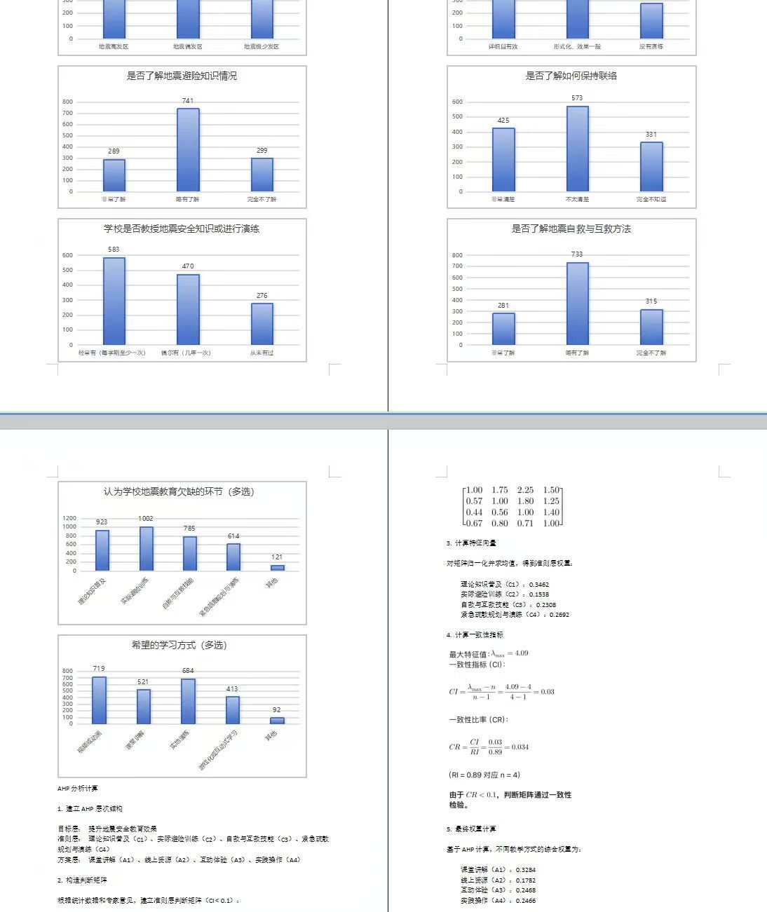 為了更準確地把握公眾對于防震減災教育的需求與偏好,團隊設計了一份全面而細致的問卷,并通過線上線下多種渠道廣泛發放,最終收集到有效樣本 1300 余份,覆蓋了不同年齡、職業、地域的廣泛人群。通過對這些數據的深入分析,采用了層次分析法(AHP)科學計算出了不同教育方法在提升防震減災意識方面的權重,為制定更加精準有效的教育策略提供了數據支持。