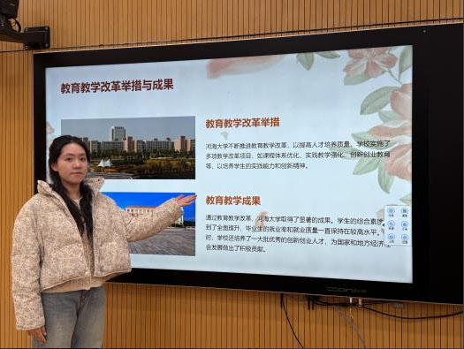 在活動的正式環節中,兩名同學分別進行了關于河海大學的主題演講,并通過PPT展示了學校的基本情況、學科設置、學術氛圍以及校園生活等內容。王兮若同學通過生動的語言和細致的介紹,講述了河海大學的悠久歷史、杰出的學術成績以及獨特的校園文化。她特別強調了學校在水利工程、環境科學、土木工程等學科領域的突出優勢,并鼓勵同學們要樹立明確的目標和理想,積極追求自己的學術夢想。唐子涵同學則分享了自己在河海大學的學習與成長經歷。她提到,河海大學不僅為學生提供了豐富的學術資源,更培養了他們的創新精神和實踐能力。她結合自己的親身體驗,講述了在河海大學參與科研項目、實踐活動的豐富經歷,以及這些經歷如何幫助自己不斷突破自我,成長為一名更具責任感和使命感的大學生。兩位同學的演講內容精彩紛呈,生動的分享不僅吸引了在場同學們的關注,也讓大家對河海大學有了更為深刻的了解。大家紛紛表示,聽完演講后,自己對未來的大學生活充滿了期待,也對選擇合適的大學充滿了信心。在演講結束后,南京市第一中學的同學們踴躍提問,氣氛熱烈。水潤秦淮小隊的成員們耐心回答了同學們的問題,解答了他們對大學生活、專業選擇以及未來發展方向的疑慮。通過這一環節,學弟學妹對即將面臨的高考和大學生活有了更加清晰的認識。