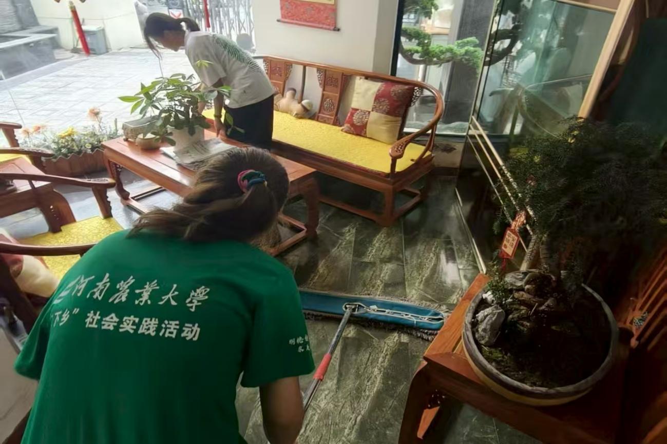 (圖1 團隊成員合影)為響應“三下鄉”社會實踐的號召,活動當天,團隊成員們早早抵達養老院。團隊在院長的引導下分成幾組,迅速投入服務工作。衛生清掃組的同學們拿著抹布、掃帚和消毒水,從一樓的棋牌室、閱覽室到二樓的走廊扶手,再到后院堆積雜物的倉庫,不放過任何一個衛生死角。擦玻璃時,幾位同學踮著腳反復擦拭窗縫里的灰塵;清理倉庫時,大家合力將舊床墊搬到陽光下晾曬。汗水浸濕了成員們的衣服,但看到煥然一新的環境,每個人臉上都露出了笑容。