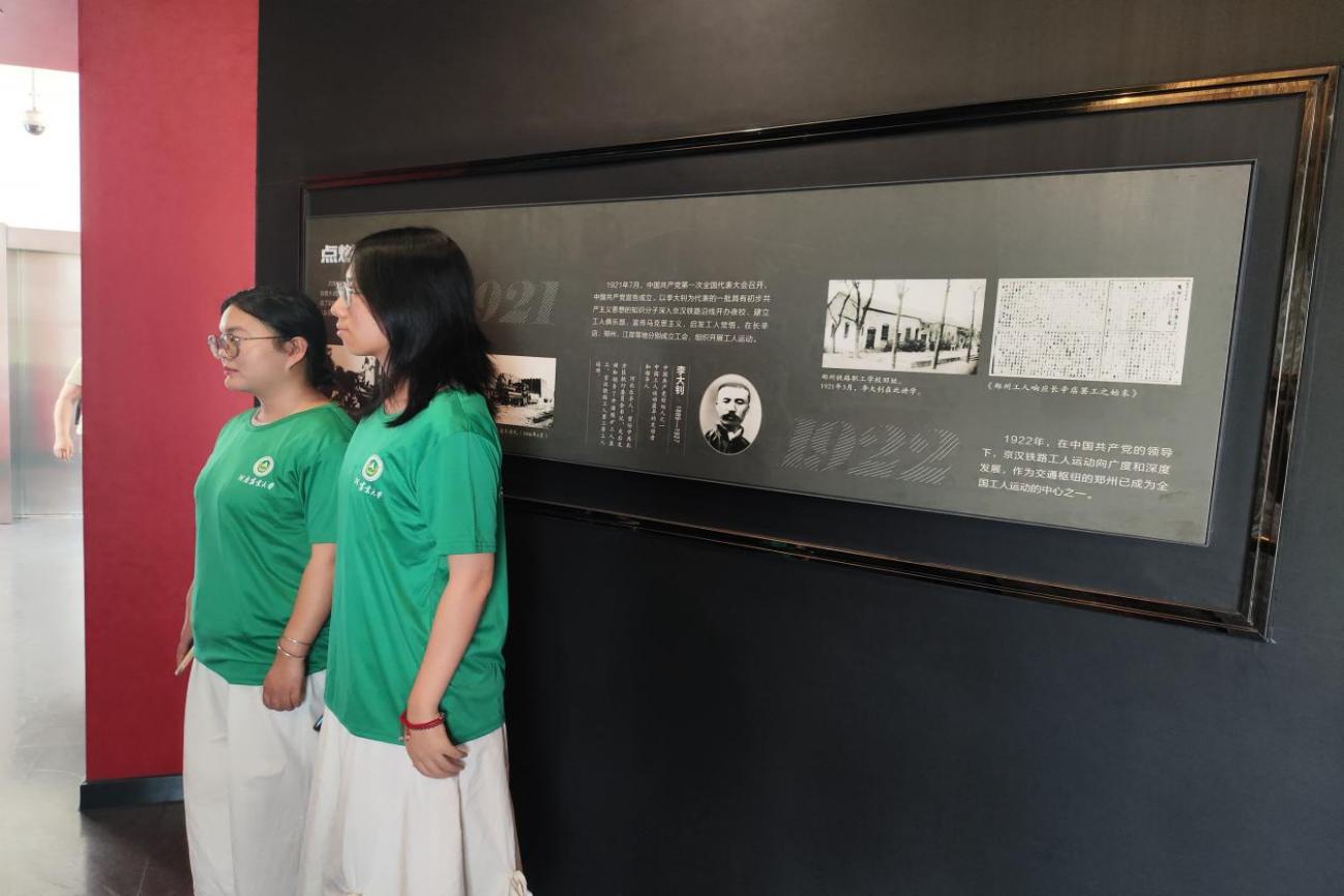 (圖二為隊員們在參觀展館)隨后,實踐團隊來到二七紀念堂。這里是當年京漢鐵路總工會成立大會的舊址,承載著厚重的歷史記憶。走進紀念堂,仿佛穿越時空,回到了那個波瀾壯闊的革命年代。在講解員的帶領下,隊員們參觀了“鐵路建設”“星星之火”“革命烈焰”“永恒豐碑”等主題展廳,展覽通過大量的歷史文物、圖片、場景復原等,全面展示了京漢鐵路工人大罷工的歷史背景、經過和深遠影響,全面了解了二七大罷工前后中國工人階級的奮斗歷程。一幅幅珍貴的照片、一件件真實的文物,無不訴說著革命先烈們為了民族獨立和人民解放而付出的巨大犧牲。隊員們不時駐足觀看,仔細聆聽講解,并不時提問交流,對二七精神的內涵有了更加深入的領悟。