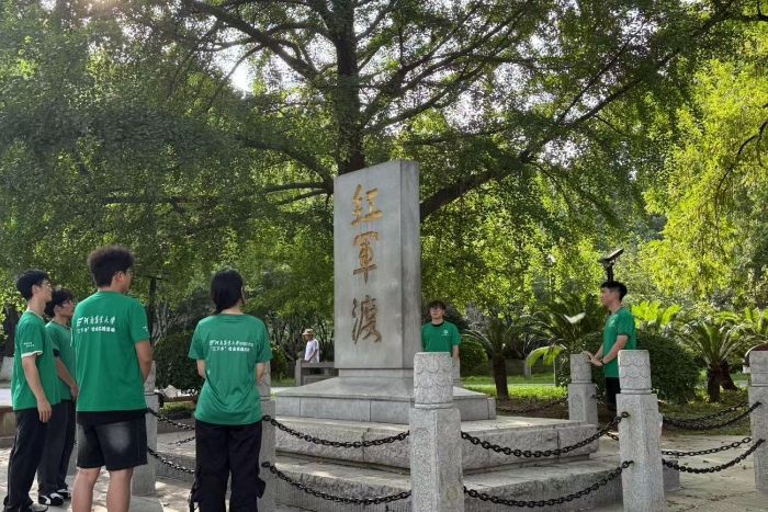 離開紀念塔,團隊來到紅軍渡紀念處。與想象中的宏大場景不同,此處僅有一座樸素的紀念碑。然而,當成員們了解到1937年彭德懷元帥率8000將士在此以少勝多、阻擊3萬敵軍的壯舉時,無不為之動容。站在紀念碑前,成員們低頭凝視碑文,追憶烽火歲月;抬頭遠望四周林立的高樓,更感使命在肩——唯有守護先烈功績、開拓時代新篇,方能告慰英魂。