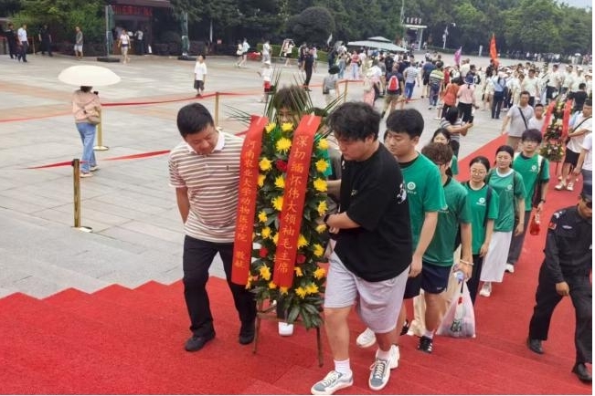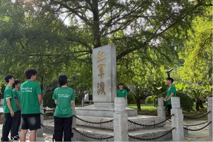 團隊首站抵達湖南烈士公園。在莊嚴肅穆的烈士紀念塔前,隊員們列隊肅立、鞠躬致敬,向為民族解放而犧牲的先烈們獻上崇高的敬意。展覽館內,泛黃的照片、斑駁的文物、銹跡的武器,生動訴說著湖南革命先輩“為有犧牲多壯志”的豪情。在紅軍渡紀念碑旁,團隊成員重溫1930年紅軍攻克長沙的壯烈歷史。他們駐足凝視,望著紀念碑四周拔地而起的高樓大廈,牢記守護先烈功績,振興泱泱華夏的使命。
