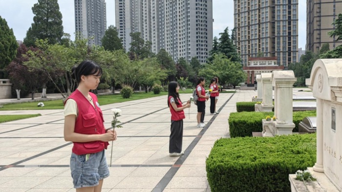 依托河南鄭州豐富的紅色旅游、教育資源,7月24日,實踐隊成員前往中原英烈紀念館參觀學習。上午9時,實踐隊成員抵達中原英烈紀念館。在講解員的帶領下,隊員們認真聆聽了楊靖宇、彭雪楓等革命先烈的英勇事跡。下午3時,實踐隊成員來到鄭州烈士陵園。隊員們懷著無比崇敬的心,排著整齊的隊伍來到紀念碑前,向革命先烈三鞠躬,隨后依次走到烈士墓前,為英烈獻上精心準備的鮮花。