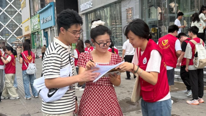 7月23日,實踐隊循著紅色足跡,深入了解國情民生,在實踐中傳承紅色基因。上午9時,實踐隊成員前往二七紀念堂參觀學習。實踐隊以二七精神為依托,組織隊員們錄制主題團課。下午3時,實踐隊在二七廣場開展了心理健康調研活動。實踐隊員積極與過往群眾溝通交流,耐心詢問大家的心理健康狀況,并向參與調研的群眾發放禮品、賀卡。經過不懈努力,實踐隊成功收集到了大量有效的調研數據,為深入了解當下民眾的心理健康狀態提供了第一手資料。