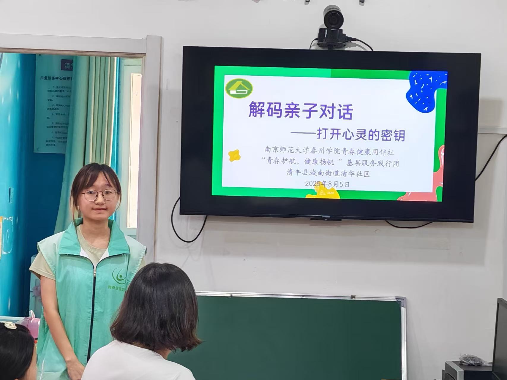為幫助青少年更好地理解父母言語背后的關愛和擔憂,并掌握恰當的親子溝通方式,幫助青少年建立良好親子關系,南京師范大學泰州學院青春健康同伴社“青春護航,健康揚帆”暑期實踐團隊協同泰州市計劃生育協會于8月6日走進河南省濮陽市清豐縣城南街道清華社區,圍繞青春健康教育成功開展了“解碼親子對話——打開心靈的密鑰”主題活動。