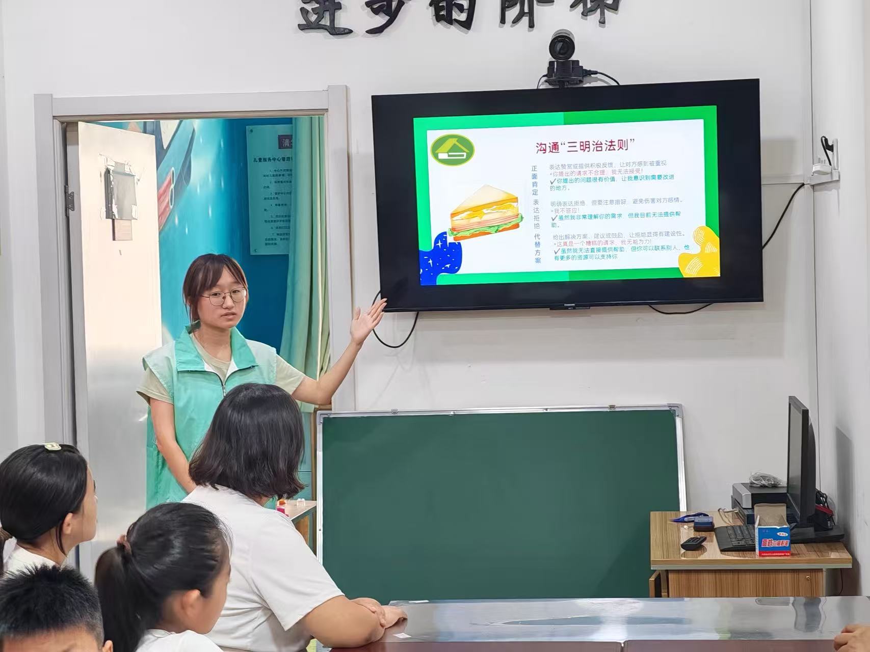 圖為團隊成員向社區青少年介紹溝通“三明治法則”。徐越 供