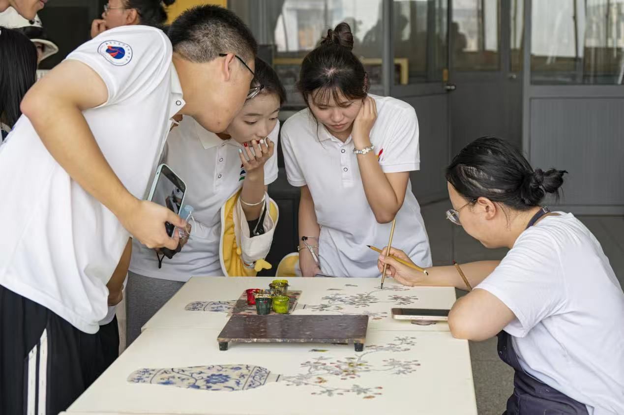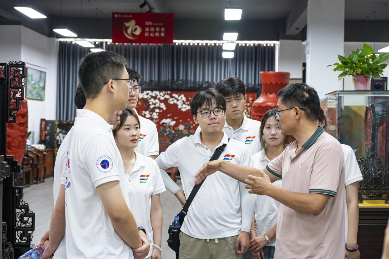 掛牌儀式后,實踐團成員在黨員工匠的帶領下開啟沉浸式研學之旅。參觀環節中,同學們走進漆器制作車間,近距離觀摩選料、制胎、髹漆、裝飾等傳統工序。黨員工匠現場演示了螺鈿鑲嵌、點螺等非遺技藝,行云流水般的操作展現出深厚功力。原本普通的材料在匠人手中煥發出獨特光澤,引得現場贊嘆連連,紛紛用鏡頭記錄精彩瞬間。