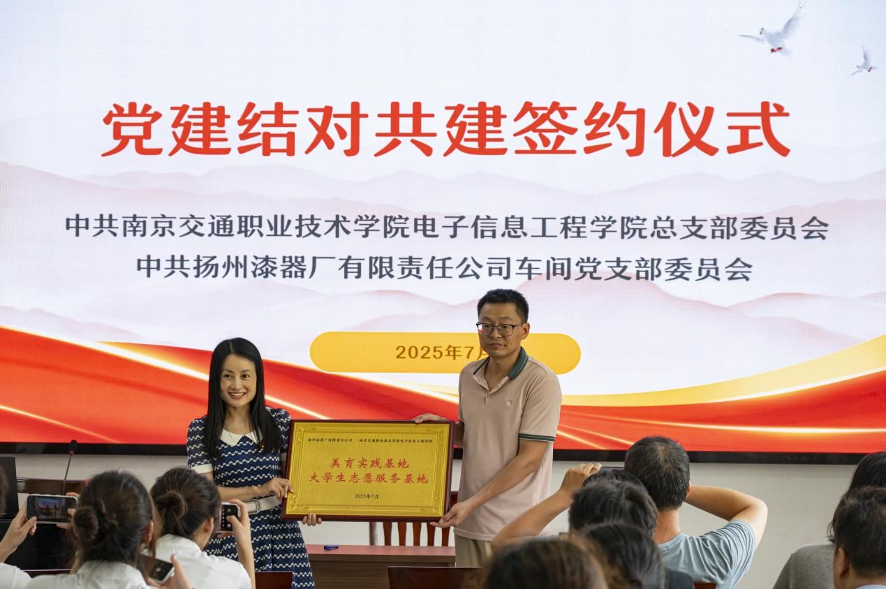 儀式上,吳蓉蓉副書記與韓鋒書記正式簽署黨建共建協議,雙方圍繞“資源共享、人才共育、文化共傳”三大方向達成共識。吳書記表示,學院將依托電子信息專業優勢,推進漆器技藝的數字化轉譯與科技賦能,助力非遺文化走進新時代。韓書記則承諾,將持續開放工坊資源,打造面向高校師生的美育研學平臺,構建高質量育人機制。