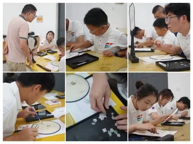 隨后,實(shí)踐團(tuán)前往制作車間,近距離觀摩螺鈿漆扇全流程制作。匠人們專注于每道工序——切割、打磨、髹漆、鑲嵌,每一步都凝聚著技藝積淀與文化精神。作為揚(yáng)州漆器代表性技法,螺鈿工藝以珍珠貝、云母等天然材料為原料,磨成薄片后按圖案精準(zhǔn)切割,再鑲嵌入漆面,呈現(xiàn)出熠熠生輝的畫面。工作人員一邊操作一邊講解:“切割要穩(wěn),鑲嵌要準(zhǔn),哪怕一點(diǎn)偏差,整體美感就會(huì)失衡。”