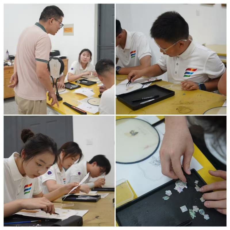 在揚州漆器廠,隊員們親身體驗了螺鈿漆扇制作。在專業老師的指導下,他們認真完成貝殼切割、圖案鑲嵌等工序。工作人員強調“切割要穩,鑲嵌要準”,讓大家深刻體會到“技在手中,藝在心中”的非遺精魂。通過親手創作,隊員們對這項于2006年列入首批國家級非物質文化遺產的工藝價值,有了更為真切的感悟。