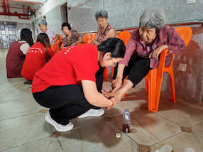圖為實(shí)踐隊(duì)隊(duì)員在晉江市洋尾村敬老院為老人進(jìn)行穴位按摩。鄭文昕 供圖