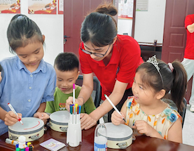 圖為實(shí)踐隊(duì)隊(duì)員在洋尾村黨群活動中心輔助小朋友們鼓面繪畫創(chuàng)作。鄭文昕 供圖
