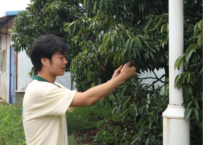 調研尾聲,實踐團成員參與勞動體驗,親手采摘桂味荔枝。在生態園技術員指導下,大家學習辨別成熟果實、規范采摘手法——“要輕捏果蒂旋轉,避免損傷枝條影響來年掛果”“采摘后及時放入透氣筐,防止擠壓變質”。穿梭在郁郁蔥蔥的荔枝林間,成員們既體會到農耕勞作的辛勞,也感受到“一分耕耘一分收獲”的樸素道理。