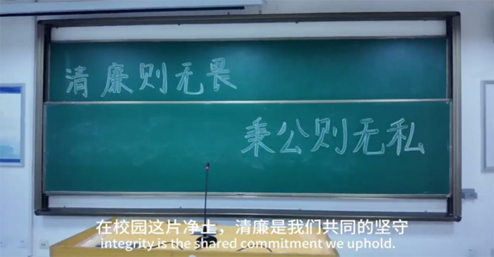 作為外國語學院的特色公益廣告,作品充分發揮專業優勢,采用中英雙語呈現。團隊精心打磨每一句臺詞,如將“清廉有畏”譯為“IntegritywithReverence”,既準確傳達核心價值,又體現文化特色。這種創新表達,讓廉潔文化突破了語言界限,展現出更廣闊的國際傳播潛力。